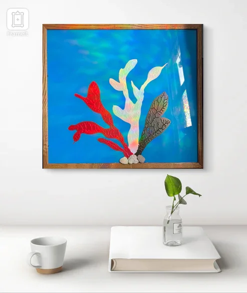 Through this work, the artist conveys the urgent sad state of coral reefs, highlighting their role as both ecological treasures and casualties of environmental neglect. The interplay between the vibrant colors and the muted, natural tones of the coral creates a visual narrative of life, loss, and responsibility. The recycled picture frame underscores themes of renewal and transformation, reinforcing the artist’s call for creative solutions to combat ecological decline.