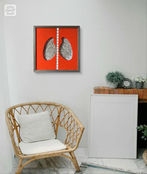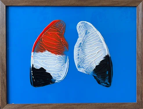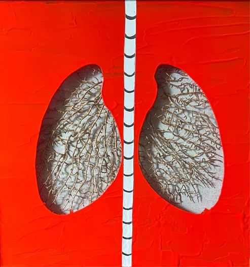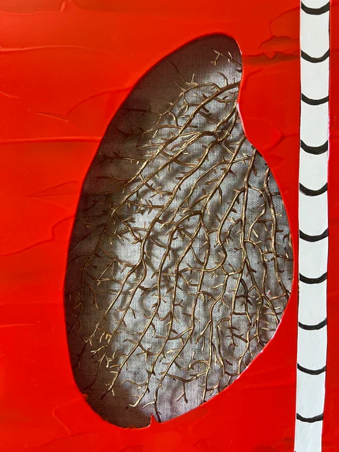 "Coral Lungs" is an acrylic painting on an up-cycled glass shadowbox. On the surface, most of the glass is covered in cadmium red paint. Except, there are two areas of negative space in the center that depict a pair of human lungs. Also, there is a vertical white stripe between the lungs that has metallic grey half-ellipses along it with each one separated an inch apart.