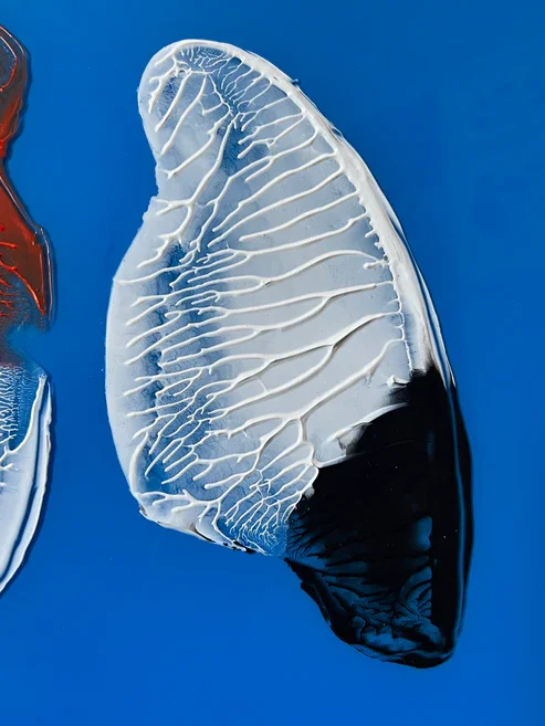 At the base of this central motif, three fragments of dead coral are affixed to the glass, their intricate, skeletal forms grounding the abstract imagery in reality. The tactile quality of the coral contrasts sharply with the smooth acrylic surface, creating a dialogue between art and life. These harvested coral pieces serve as both a literal representation of loss and a tangible reminder of humanity’s intimate connection to the ocean’s ecosystems.