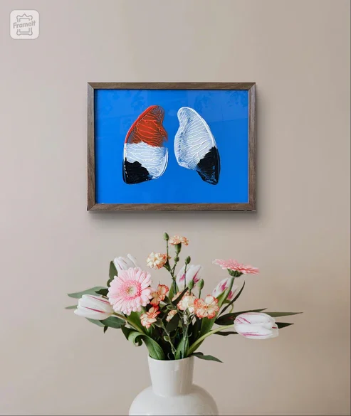 This is an acrylic painting that I created on an up-cycled picture frame. The subject is a pair of transparent, tri-colored human lungs centered on an opaque blue background. The mood I was going for is medical. The artwork’s composition focuses the viewer’s attention on the subjects with precision and attention to detail around every curve.